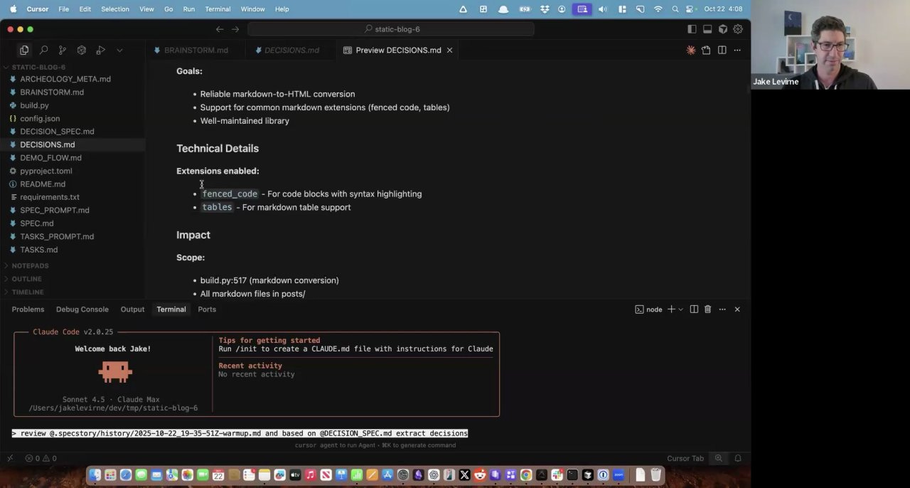 The prompt was simple: “review that [transcript] and then based on decision spec, let’s extract decisions that were made and write them to decisions.markdown” [27:42].