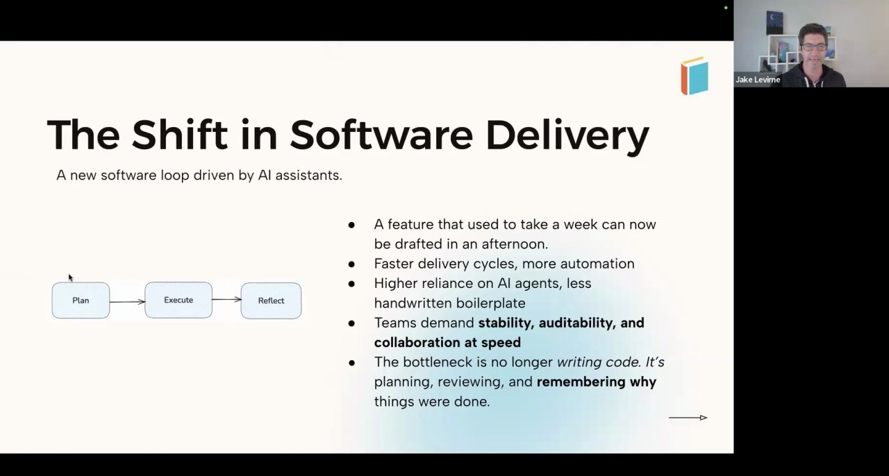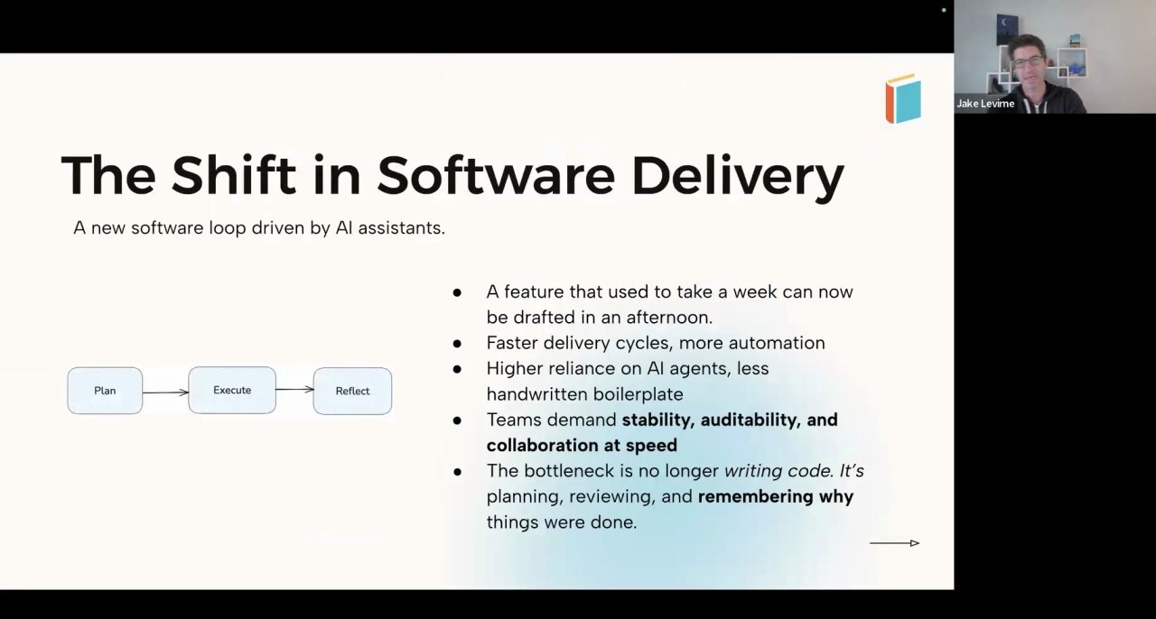 Jake started by discussing the shifts in software delivery. Features can often be built much quicker now than in the past thanks to advancements in AI. But stability, auditability, and collaboration at speed is a problem that’s magnified by this change. While aspects related to coding have sped up (thanks to many of the tools I listed above) they have not improve the planning, reviewing, and intent part of developing products to the same degree.