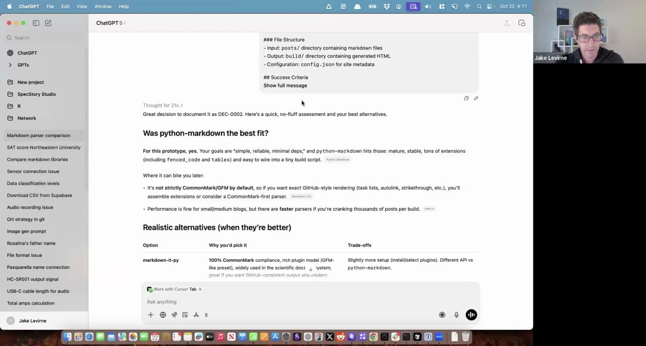 This decisions.md file isn’t just a static report; it’s a springboard for further work. Jake demonstrated this by taking an AI-made decision, the choice of the markdown library, and asking a different AI (ChatGPT) to analyze it [37:37].