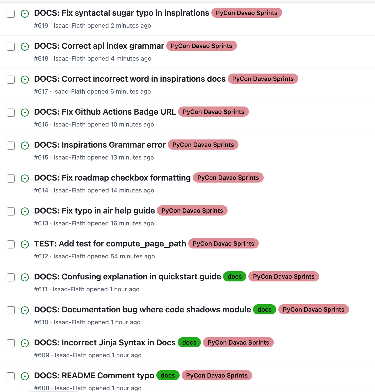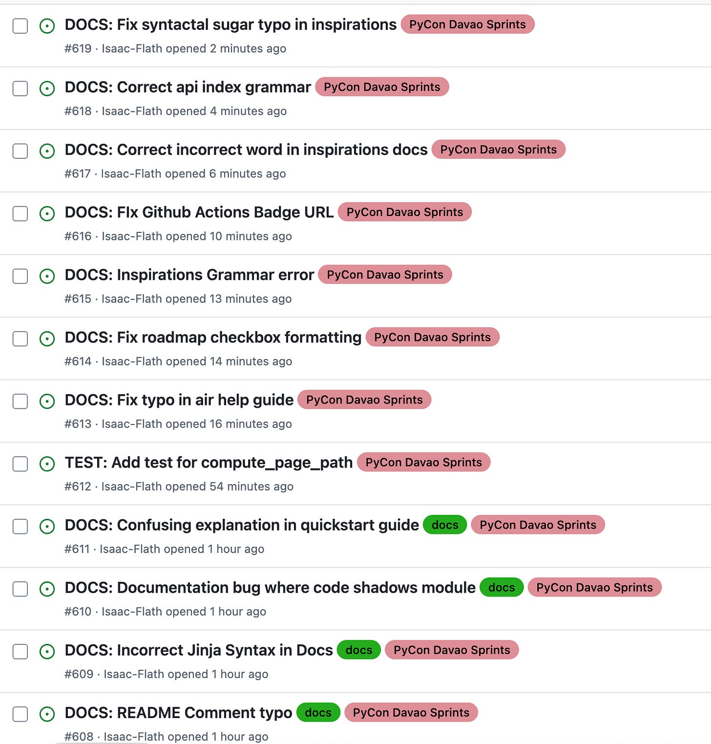 One thing they wanted prep help for? Issues. Not just any issues, but tiny ones. Think single-character typos, small grammar fixes, confusing sentences in the docs. We needed tasks simple enough for someone who might never made a pull request (PR) before to an open source project. These small tasks allow newcomers to practice the mechanics of contributing without getting lost in complex code.