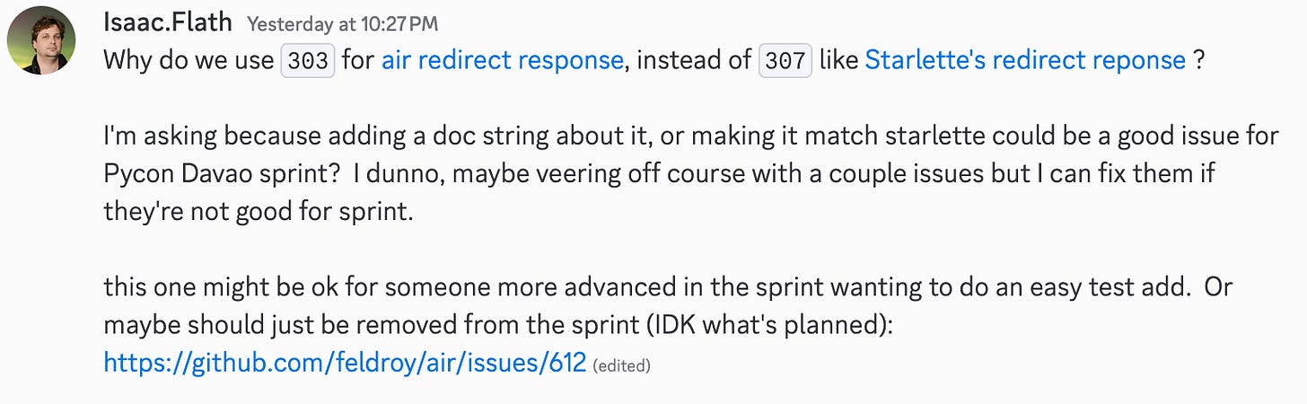 PyCon Davao was approaching. With it came a sprint for Air, a new web development library. Daniel and Audrey Roy Greenfeld were leading the sprint, expecting contributors of all skill levels. I wanted to help, even though I couldn’t attend.