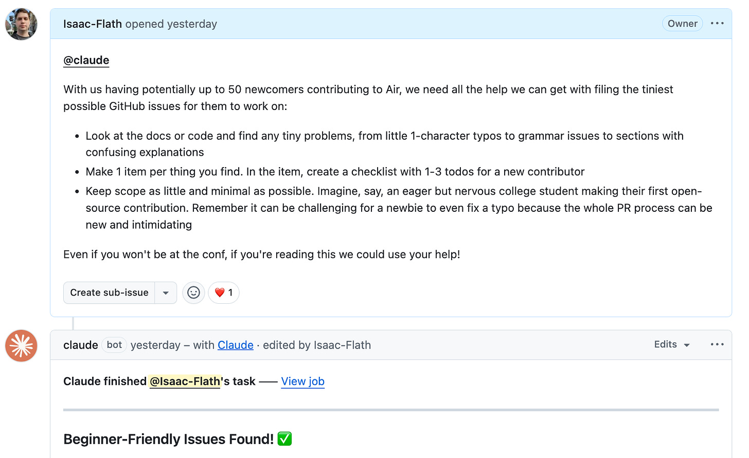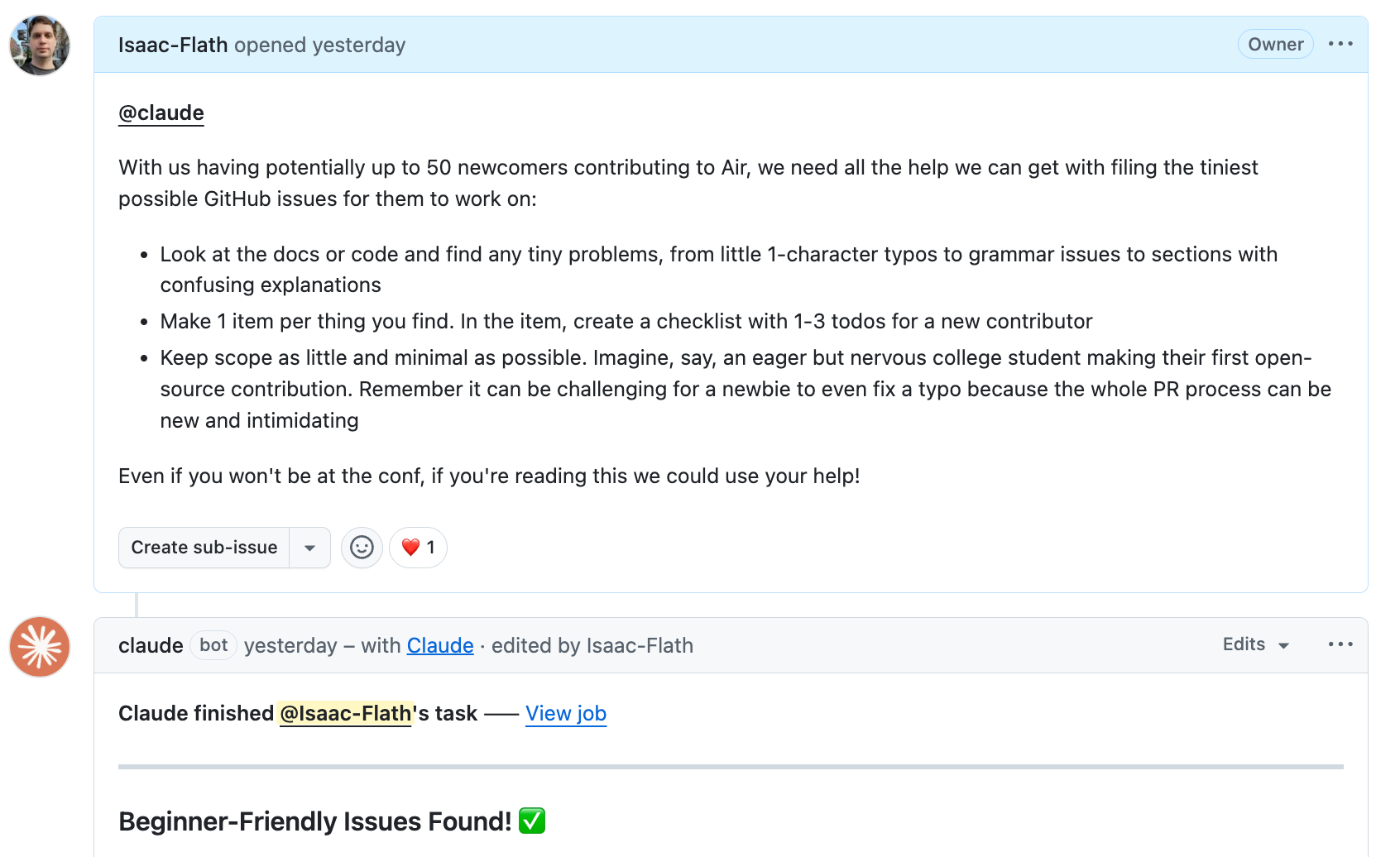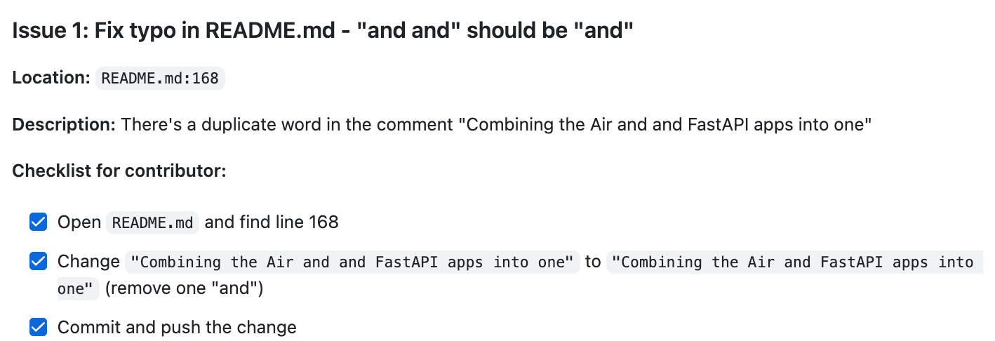 The result? I had created 19 small, actionable issues ready for newcomers quicker than I would have on my own. On my own, I probably would have stopped at 10 issues.